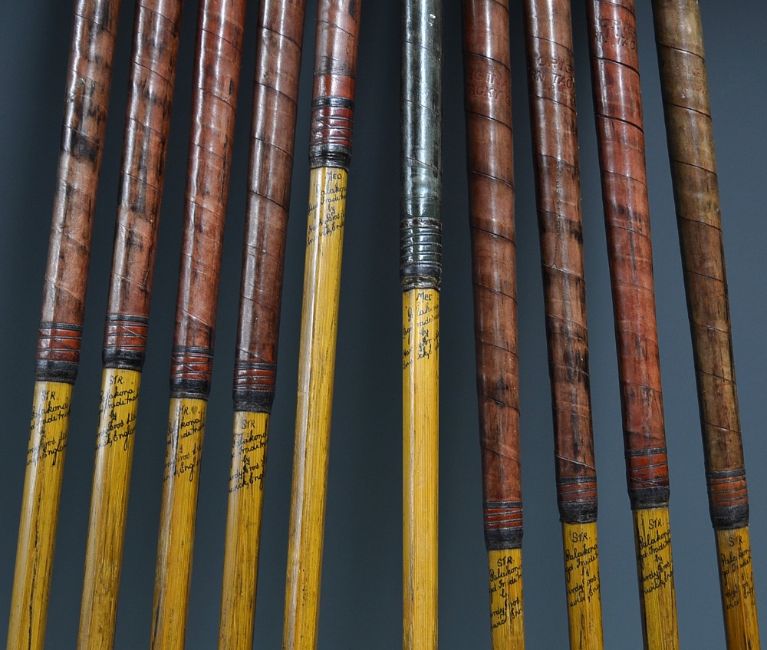 Scarce set of 11x Palakona woods and irons - comprising a Driver and Spoon stamped Hoylake to the sole and both with alloy sole inserts together with irons nos 1-8 and a goose neck blade putter stamped no. 9 - all fitted with famous Hardy Bros Alnwick Palakona steal centre shafts with matching grips