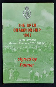 Rare 1961 Open Golf Championship programme signed by the winner Arnold Palmer - played at Royal Birkdale and signed on the centre fold course plan following his first Open victory with a score of 284 - very clean copy - some very minor creases to spine (G)
