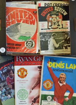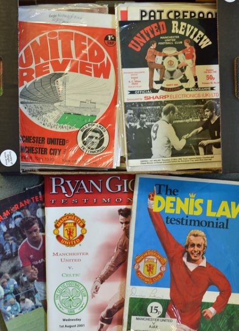 Collection of Manchester United Testimonial match programmes to include Denis Law, Ryan Giggs, Tony Dunne, Bill Foulkes, Martin Buchan, Gordon Banks plus others. (A box)