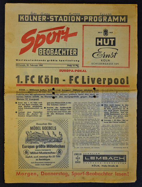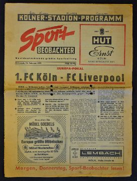 1964/1965 Cologne v Liverpool European Cup 'Beobachter' newspaper edition Fair, punch holed.