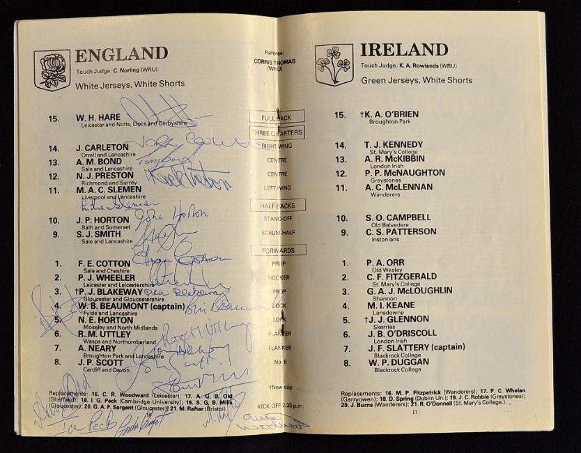 1980 England (Grand Slam) v Ireland signed rugby programme - signed to the team line up page by all the England team and reserves to include Dusty Hare, John Carlton, Mike Slemen, Tony Bond, Steve Smith, Fran Cotton, Peter Wheeler, Billy Beaumont, Roger Uttley, Tony Neary, John Scott, Clive Woodward (replacement) Mike Rafter et al (VG)