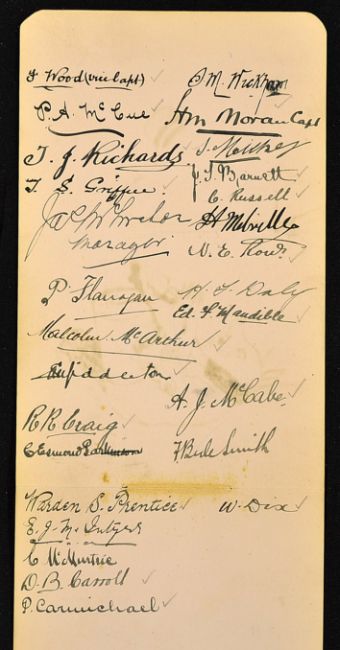 Rare 1908 Australia rugby team autographs - from the first ever rugby tour to the U.K/ northern hemisphere comprising an album page signed by 27 Wallabies incl the Captain Paddy Moran, Manager McMahon, legend Dan Carroll, Vice Capt Fred Wood, McCue, Richards, Flanagan, McArthur, Craig, Prentice, Carmichael, Russell, Daly, McCabe, Daniel Carroll, et al including 17 players who were selected to play against England winning 9-3 and narrowly losing 9-6 to Wales
