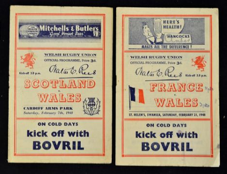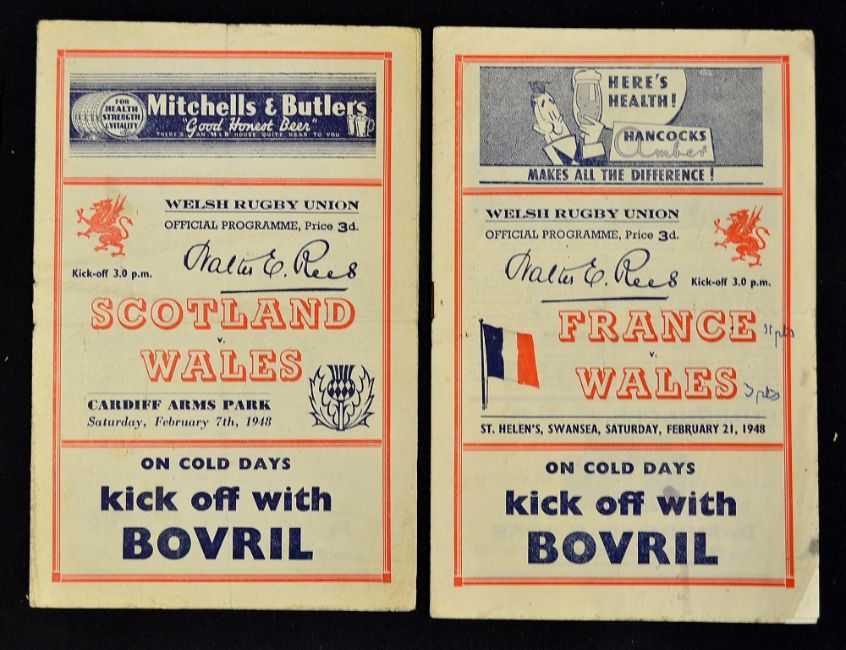 2x 1948 Wales rugby programmes to include v Scotland Cardiff Arms and vs France (Runners Up) St Helens Swansea - slight pocket folds to both otherwise overall (F/G)
