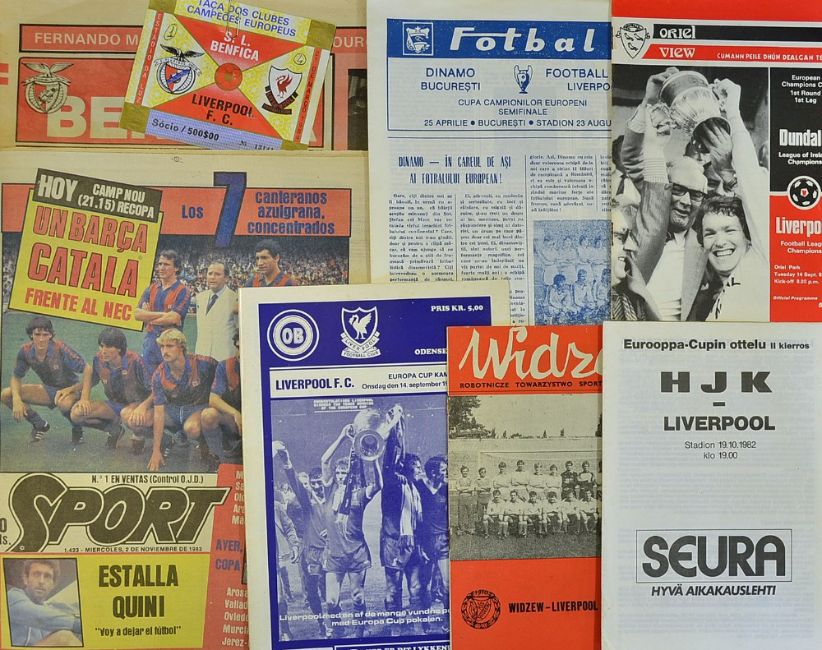 European Cup Liverpool away football programmes 1982/1983 including Dundalk, HJK Helsinki, Widzew Lodz, 1983/1984 Ob Odense, Atletico Bilbao (newspaper), Benfica (newspaper with slight damage), Benfica match ticket, Dinamo Bucharest (semi-final issue). NB: No official programmes for 1983/1984 Bilbao and Benfica matches.