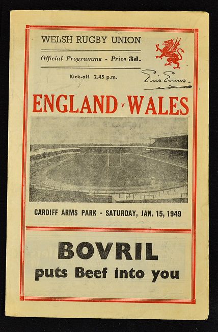 1949 Wales v England (Runners up) rugby programme - played at Cardiff Arms Park on 15th January usual pocket wear, with some soiling to the centre pages and slight staple rust hence overall (F)