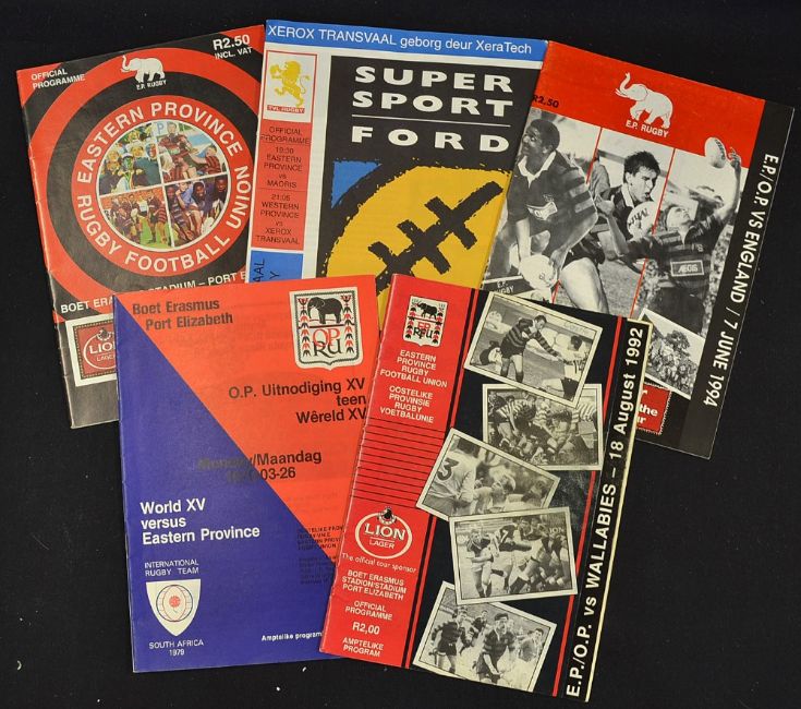 Interesting collection of visiting Rugby tourists to Eastern Province programmes from 1979 onwards to incl v World XV '79 (and written team changes), v Australia 92, v England 94, v New Zealand 96 and Maoris including signed Western Province v Transvaal team sheet overall (VG) (5)