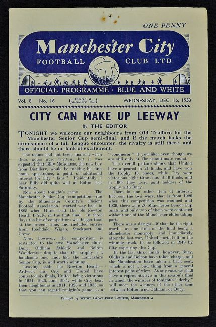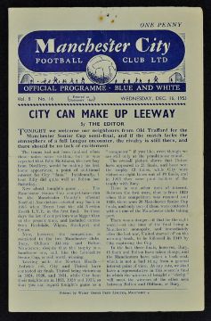 1953 Manchester City v Manchester United football programme16 December semi-final of the Manchester Senior Cup at Maine Road match programme. Fair to good, has tiny pin hole, pencil team changes.