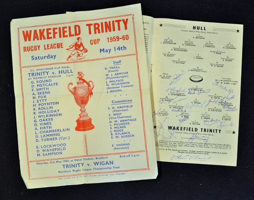 1960 Wakefield Trinity Rugby League Challenge Cup Final signed programme, signed dinner menu and a team match broad sheet - unused programme signed by all the team to the team line up page together with Semi Final programme, 1960 Annual Dinner Menu with 14 signatures to the cover incl Derek Turner and red and white Cup Final flyer (4)