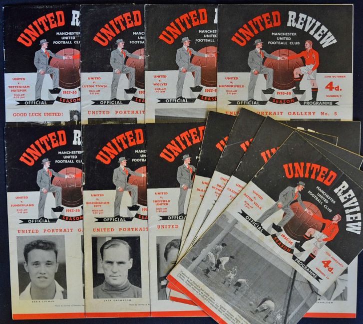1955/1956 Manchester United home match programmes v Spurs, Luton, Wolves, Huddersfield, Sunderland, Birmingham City, Sheffield Utd, Burnley, Aston Villa, Cardiff City, Bolton Wanderers, Blackpool. (12) Fair-Good.