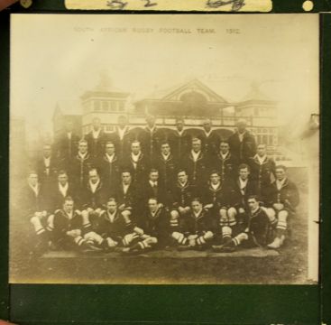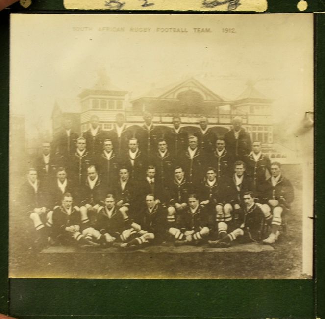 1912/13 South Africa Springboks rugby team photograph glass plate - from the tour in UK approx. 2.5 square mounted glass slide S.A tourists of 1912-13, probably at Cardiff Arms Park. (G)