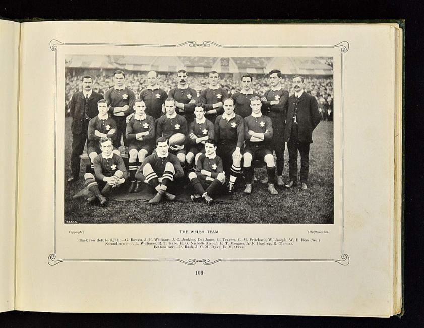 Very Rare 1906 South Africa First Rugby Tour Souvenir Book titled - "South African Souvenir of The Springbokken Tour in Great Britain " 1st ed 1907 edited by E J L Platnauer publ'd by Geo Wunderlisch Johannesburg - in the original decorative green cloth boards (some rubbing) - magnificent book detailing the first ever tour of UK by the first ever Springboks, contains details of every match and many team and action photographs, players biographies- front and rear end boards and free end plates discoloured, hinges visible but all intact, and 4 pages have tears nevertheless overall (F/G)