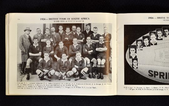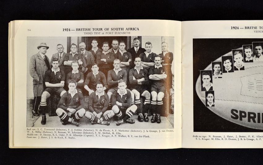1956 South Africa Rugby Booklet - titled "South African Rugby Test Teams 1891 -1956" - excellent team pictorial reference dating back to the first ever test match played again the British tourists in 1891 original pictorial wrappers c/w all results to the centre pages - very slight staple rust, owner name hand written to the front cover otherwise(G)
