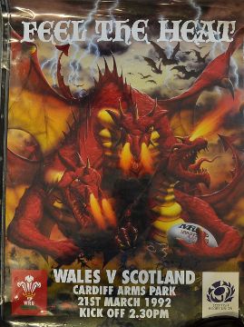 2x 1992 Wales Five Nations Red Dragon Rugby Posters - titled Return of The Dragon v France and Feel Heat v Scotland both played in Cardiff - overall 33 x 23.25"