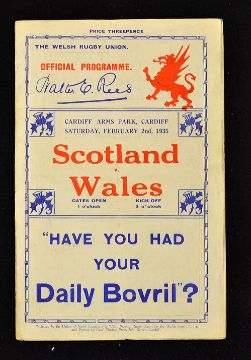 1935 Wales v Scotland rugby programme-played at Cardiff Arms Park on Saturday 2nd February, usual pocket fold, some soiling to the back covers some minor blemishes the exposed fold internally clean (F/G)