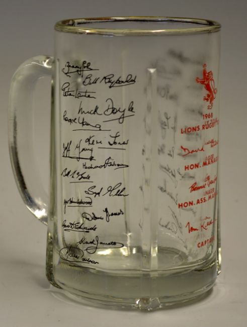 Rare 1968 British Lions Rugby Tour to South Africa commemorative glass tankard - 1pt gilt rimmed glass tankard with facsimile signatures of the players and tour management (G)