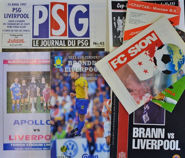 ECWC 1992/1993 Liverpool away football programmes such as Apollon Limassol, Spartak Moscow, UEFA Cup 1995/1996 Spartak Vladikavkaz, Brondby, ECWC 1996/1997 Mypa, Sion, Brann, Paris St. Germain (semi-final) (8) Good.