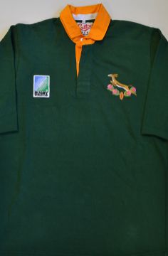 Very Rare 1995 Rugby World Cup South Africa Players Shirt from the opening game worn by South African Captain Francois Pienaar - No 6 short sleeve shirt with embroidered IRB and Springbok Crests for the opening game against Australia played at Newlands Cape Town with S.A winning 28-18 and going onto win the final against NZ 15-12. Again the final will be well remembered for being played in the presence of President Nelson Mandela wearing his South Africa shirt on the occasion of South Africa winning hard fought final against the mighty New Zealand All Blacks - comes c/w coa of authenticity from a well-known and highly respected South Africa rugby collector Note The World Cup was the 1st major sporting event to take place in South Africa following the end of apartheid. It was also the 1st World Cup in which South Africa was allowed to compete having only just been readmitted in 1992 following the end of apartheid. The World Cup was also the last major event of rugby union's amateur era.