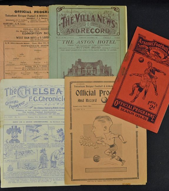 Pre-war football programmes to include 1928/1929 Aston Villa v Sheffield Utd Reserves, 1929/1930 Chelsea v Bury, 1934/1935 Arsenal v Chelsea, 1938/1939 Tottenham Hotspur v Brighton Reserves, 1945/1946 Tottenham Hotspur v FA XI. (5) Condition varies.
