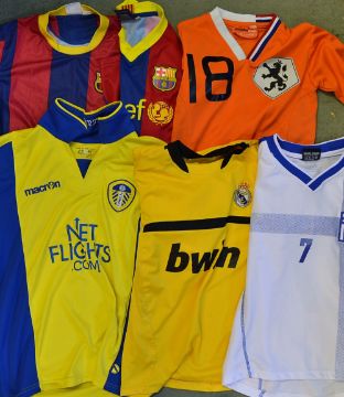 Selection of Junior Football Shirts includes Barcelona, Holland, Leeds, Holland, Leeds United, Real Madrid, and Greece, all short sleeve, inspection recommended (6)