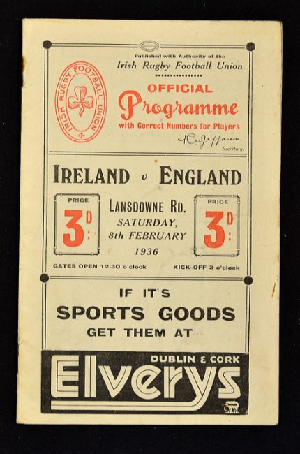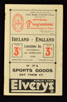 1936 Ireland v England rugby programme - played at Lansdowne Road 8th February some slight pocket wear, and soiling to the covers, some staple rust and hand written scores to the centre pages otherwise clean (F)