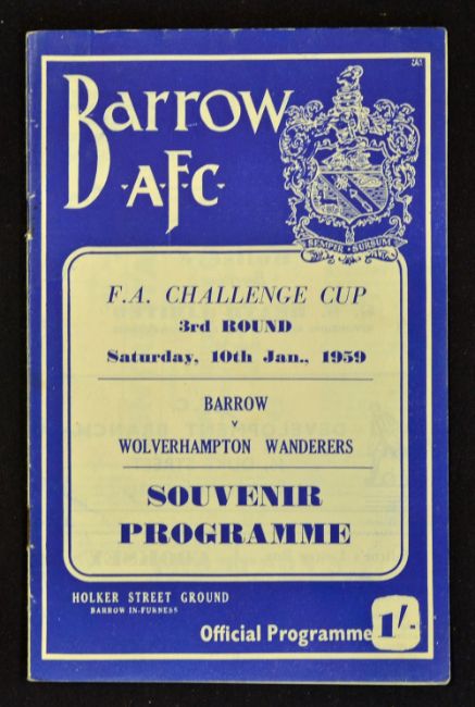 1958/1959 FA Cup match programme & ticket Barrow v Wolverhampton Wanderers 3rd Round at Holker Street. Good. (2)