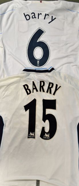 2000/01 Gareth Barry match worn football shirt a short sleeve away shirt with no15 to the reverse with premier league badges to sleeves, together with 2008/09 Gareth Barry match worn Europa League Aston Villa match worn football shirt No6 a long sleeve away football shirt with UEFA Cup badge to sleeve - sizes 46/48" and XL (2)