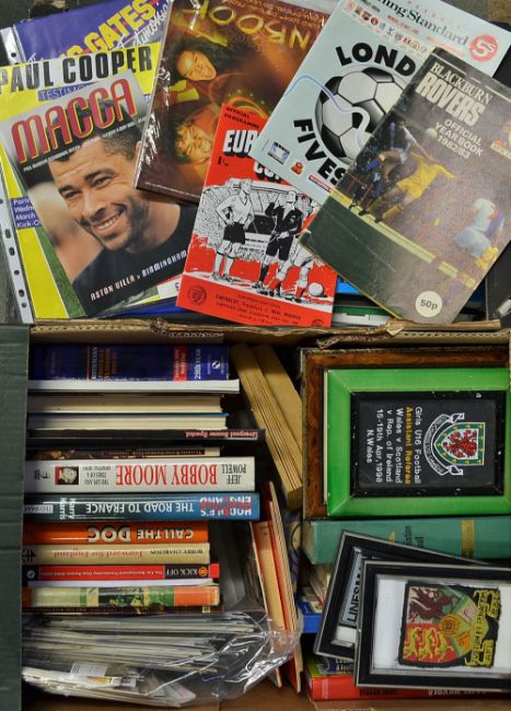 Mixed Football Ephemera - a box of mixed football ephemera to include FDCs, Photographs, Prints, Books, varying programmes, some signed Ephemera, yearbooks, inspection will reward (Quantity) 2 Boxes