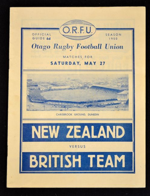 1950 British Lions versus New Zealand rugby programme: opening test match played at Dunedin on Saturday 27th May, match was drawn 9-9 - 16pp programme issued by the Otago RFU - slight pocket fold and slight staple rust otherwise overall (G)