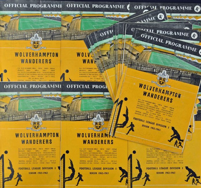 Wolverhampton Wanderers home league football programmes complete season 1962/1963 plus West Bromwich Albion (26 December-Postponed), Blackpool (22 December-Postponed). Generally Good. (23)
