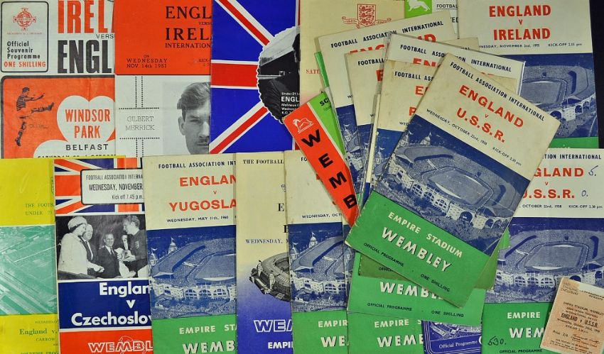 England International football programmes from 1951 to 1977 to include 1951 England v Ireland (pirate), 1951 England v Ireland official, 1958 England v Wales, 1956 England v Brazil, 1963 England v Brazil, 1955 England v Ireland, plus others, worth inspecting (23) overall F/G