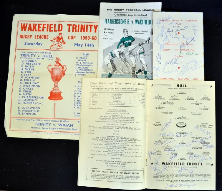 1960 Wakefield Trinity Rugby League Challenge Cup Final signed programme, signed dinner menu and a team match broad sheet - unused programme signed by all the team to the team line up page together with Semi Final programme, 1960 Annual Dinner Menu with 14 signatures to the cover incl Derek Turner and Cup Final flyer (4)
