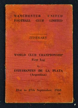 Very scarce Manchester United official club itinerary for the 1968 World Club Championship Estudiantes de la Plata v Manchester United. covering the dates 21st - 27th September 1968, official party of 10 officials (including Matt Busby and Jimmy Murphy) plus 18 players to include Best, Brennan, Burns, Charlton, Crerand, Dunne, Fitzpatrick, Gowling, Kidd, Kopel, Law, Morgan, Rimmer, Ryan, Sadler, Stepney and Stiles. The official party travelled by air, flights, Manchester to Heathrow, Heathrow to Orly Paris, Orley Paris to Madrid, Madrid to Rio de Janeiro, Rio de Janeiro to Buenos Aires; the match took place on 25 September 1968. Small 12 page red card item for which notes inside includes important notices of what not to eat and drink plus each player was only allowed £15 in sterling pound notes. Good.