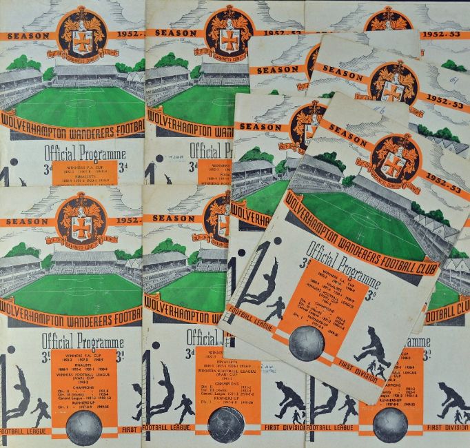 1952/1953 Wolverhampton Wanderers home programmes v Arsenal, Burnley, Cardiff City, Liverpool, Manchester City, Portsmouth, Preston NE, Sheffield Wednesday, Stoke City, WBA. Fair-Good. (10)