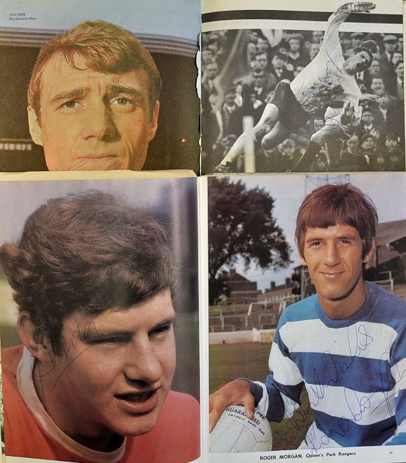 Three football books from late 1960's to include autographs by Hibernian (1967), Celtic (1967), Rangers (1967), Manchester United (1967), plus many other players noted including Peter Thompson, Johnny Byrne, Les Allen, Ian Callaghan, Bobby Robson, Paul Reaney, Ian Storey-Moore, Ian St. John, Rodney Marsh, Nat Lofthouse plus many others. (100's of signatures in ink/ball pen). (3 books)