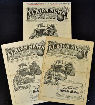 1944/1945 War League West Bromwich Albion v Wolverhampton Wanderers match programmes 25 November 1944 and 26 May 1945, also 1945/1946 v Wolverhampton Wanderers 23 April 1946. Fair-Good. (3)