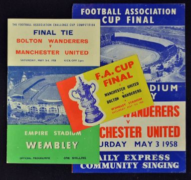 1958 FA Cup Final programme Bolton Wanderers v Manchester United + community singing sheet, also pocket sized booklet by the Daily Express featuring photos of both teams. Fair-Good. (3)