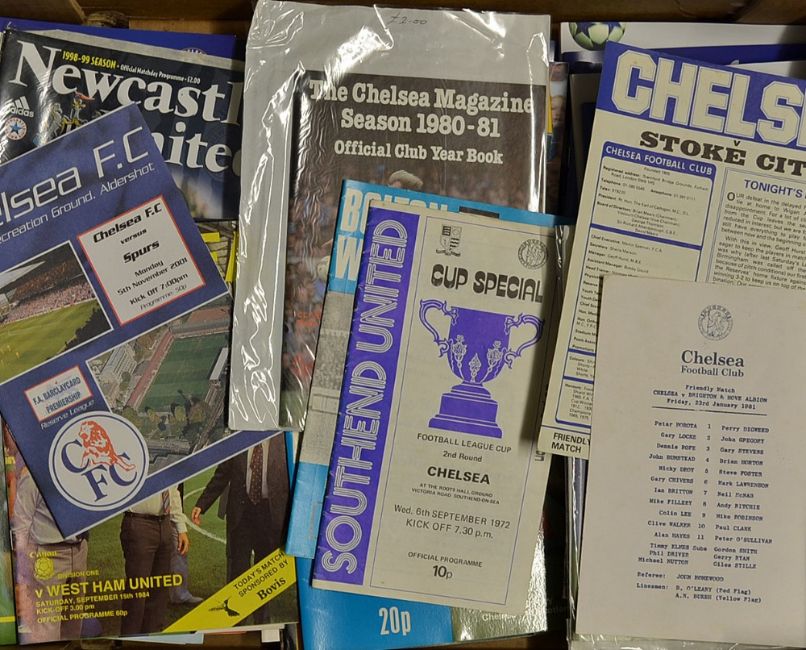 Collection of Chelsea football programmes in the 2000s but also includes 1979/80 Stoke City (friendly), 1980/81 Brighton (friendly), 974/75 Chelsea Magazine, 1980/81 Official Yearbook plus aways, 1971/72 Bolton Wanderers (FLC), 1972/73 Southend United plus others, worth inspecting (Quantity) Box
