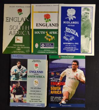 England and Regional rugby match programmes v South Africa from the 1970's onwards (5): 4x England v South Africa 69, 92, 98 (press cuttings), & 01(song sheet) together with Midlands v South Africa '92 (Leicester) - all very clean (g)