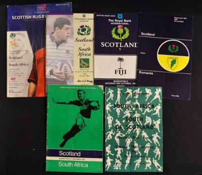 South Africa Springbok rugby match programmes in Scotland from the 1960's onwards (6): to incl v South of Scotland '60; 3x v Scotland '69, '94 and '98; together with Scotland v Romania '81 and v Fiji '89 - some slight pocket wear but generally overall (G)