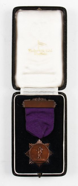 1950 England v Scotland Boys International bronze golf medal c/w ribbon and bar - engraved on the reverse -" Twenty Second Boys-Golf International-England versus Scotland-Royal Lytham and St Anne's Golf Club-1950" made by Walker and Hall Sheffield in the makers original fitted hinged case - Note Scotland won 8.5-3.5 with Sam Brough being one of only three players to win their singles match