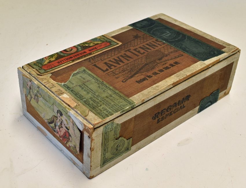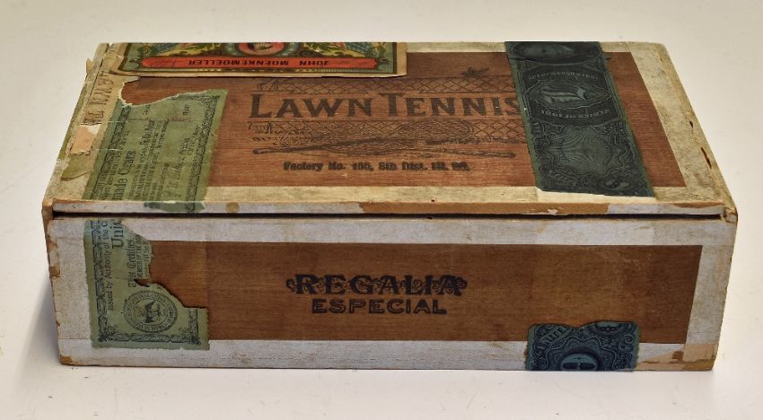 Tennis - Early 20th Century Lawn Tennis Cigar Box with accompanying labels, the box engraved with 'Lawn Tennis' details to top, 'Regalia Especial' to the front, appears with original labels externally of 'John Moenkemeller, Pekin, Illinois, Factory No 155, 8th Dist', stamped 1903, internally has original Lawn Tennis paper details, appears with some minor wear, tears to some of the labels as expected, o/w generally a nice example, measures 23x13x7cm approx.
