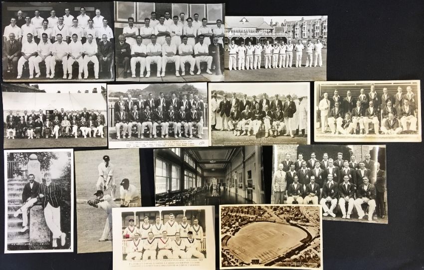 Cricket - Team Photographs and Postcards including 1930 Australian Touring Team v H.D.G. Leveson Gowers XI at Scarborough with hand written match information to the rear, 1956 Australia v T. N. Pearce's XI with written information to the rear, 1921 England v Australia team photo postcard, 1954 MCC cricket team touring West Indies & British Guiana 1954, County Cricket Ground, Trent Bridge, Nottingham, 1950 MCC Australian tour and others, including two later reprints. (13)