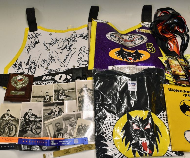 Speedway - Wolverhampton Speedway Signed Racing Jacket signed to the reverse in ink extensively together with another No.5 Jacket plus a selection of early Wolverhampton Speedway Real Photo Postcards (7) appear unused, plus photos (4), a Wolverhampton T-Shirt, a Michael Max Testimonial Sunday 23rd May 2004 Plaque and a selection of Media and guess passes (20)