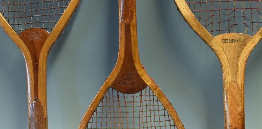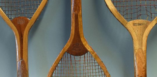 Tennis - Selection of Early Tennis Rackets to include 19th Century 'Jacques of London' early racket, a 'John Piggot 117 Cheapside and Milk Street London' racket, a fan shape head with early rounded grip and 'The Marvel' racket, all with convex wedges, with leather butt caps attached, some strings broken to two rackets the remaining racket with good strings, otherwise all appear in G condition (3)