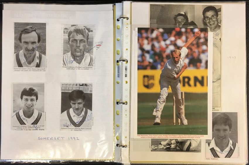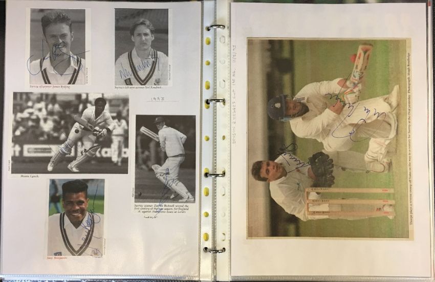 Cricket - Somerset, Surrey, Sussex and Yorkshire Counties Players Signatures on newspaper & magazine cuttings, photocards and other related items including players Roland Lefebvre, Neil Mallender, Graham Rose, Mark Lathwell, Neil Burns, Andy Hayhurst, Kevin Shine, Richard Hurden, David Ward, Graham Thorpe, James Boiling, Neil Kendrikc, Monte Lynch, Joey Benjamin, Alec Stewart, David Smith, Alan Wells, Keith Greenfield, Bill Athey, Paul Jarvis, Martyn Moxon, Richard Stemp, Mark Robinson, Simon Kellett and others, c.1990's, approximately 124, some card mounted, all housed in folder.