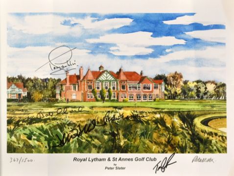 Royal Lytham and St Anne's Open Golf Championship print signed by 7 past winners to incl Peter Thomson (1958), Bob Charles (1963), Tony Jacklin (1969), Tom Lehman (1996), David Duvall (2001) and Ernie Els (2012) and signed by the artist Peter Slater, ltd ed no 367/1500 - two slight vertical creases and ready for framing overall 12" x 16"