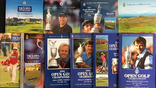 Collection of 10x Open Golf Championship programmes from 1991 - 2000 - a complete run all in very good condition - most with draw sheets for the final days play and other days together with the rare Open 2000 Past Champions Challenge programme with starting times played over 1st, 2nd, 17th and 18th holes St Andrews