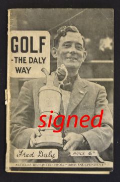 Daly, Fred signed booklet - "Golf - The Daly Way" signed by Open Golf Champion (1947) to the Foreword page - in the photograph wrapper - comprising articles re-printed from Irish Independent - some wear, slight creases and tear down the spine - back cover slightly soiled (F)