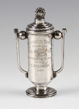 Scarce 1938 John Moores Littlewoods art deco style silver golf trophy - hallmarked Sheffield 1938 engraved with golfing figures, golf ball mounted handles and engraves Presidents Trophy - Presented by John Moores Esq., - to the Gents Golfing Section - winner - C Hodkinson 1938" - overall 5.75"h - wt 6oz# comes with a letter of authenticity directly from Littlewoods (2)