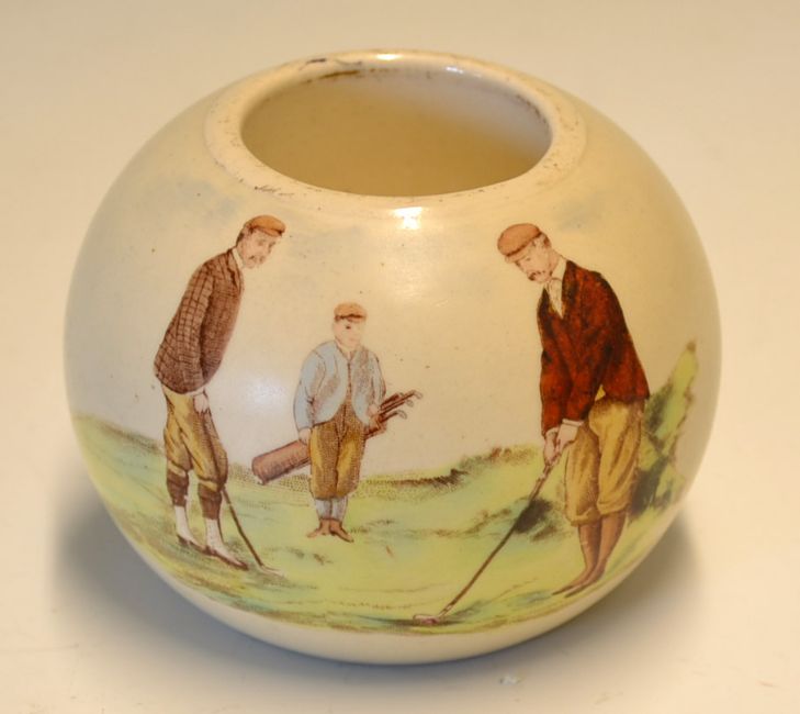 Large "Carlton Ware" golfing pottery matchstick holder c.1910 - hand-painted coloured golfing scene base stamped with blue W&R trademark and Rd No.254737 overall 2.75"h x 3.5" dia max (G).